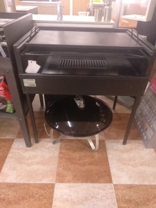 Dos mesas de trabajo negras abatibles con 6 ganchos portautensilios a ambos lados y pequeño armario en la parte inferior, donde colocar la botella de gas de 6 kg, que queda oculta tras la puerta abatible.