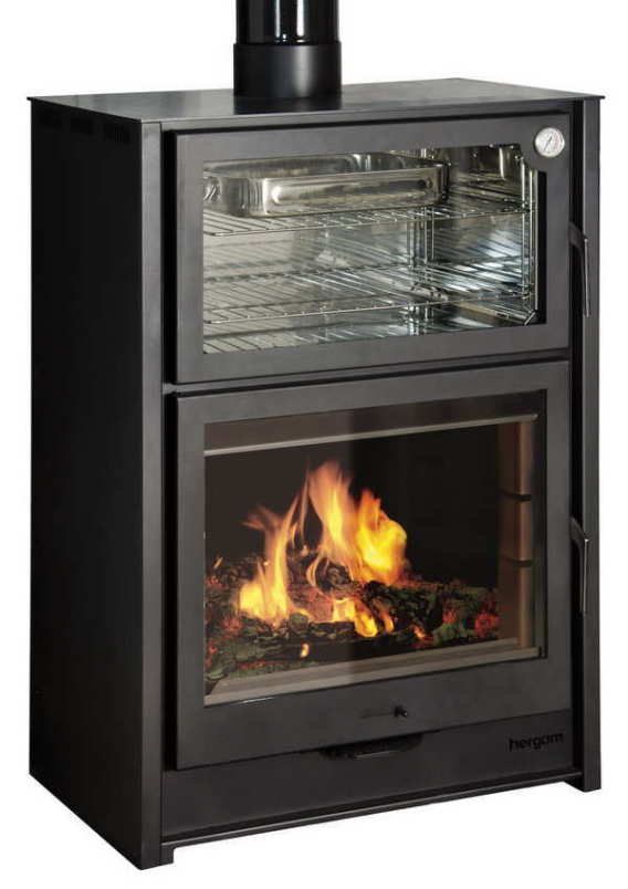 Estufa de leña de radiación con horno, con exterior de acero e interior en acero inoxidable y vermiculita. Con una potencia nominal de 12 kW, calienta hasta 100 m2. Rendimiento del 80%. Salida de humos superior. Peso: 158 Kg. Medidas: 70,5 x 107,5 x 47,5 cm (ancho x alto x fondo). Con doble función de cocinado y desmontable para su limpieza.