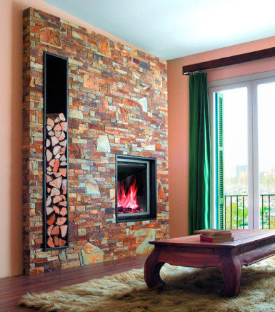 Chimenea mural realizada en piedra natural con leñera metálica vertical acabada en negro. Incorpora el hogar panorámico.