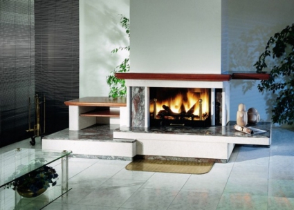 Chimenea con moldura en mármol Becco y mármol Iride Diverso. La repisa es de madera. Con hogar metalico 070 abierto, con