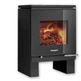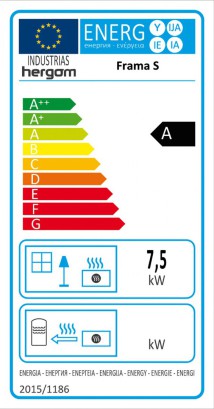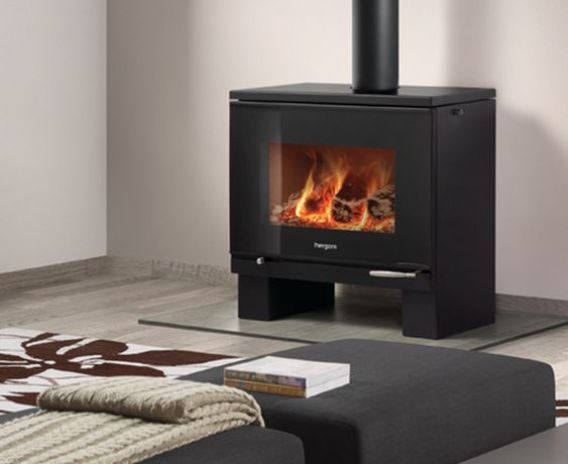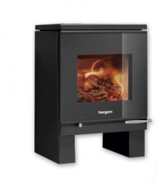 Estufa Hergom Frama S, fabricada en acero, reforzada con vermiculita y ladrillo refractario. El gran cristal serigrafiado permite una espectacular visión del fuego.