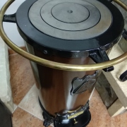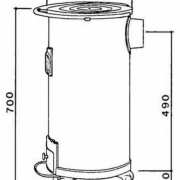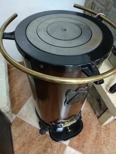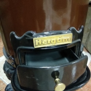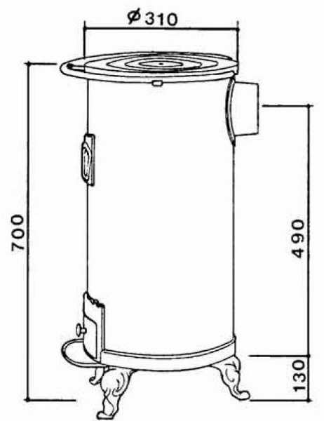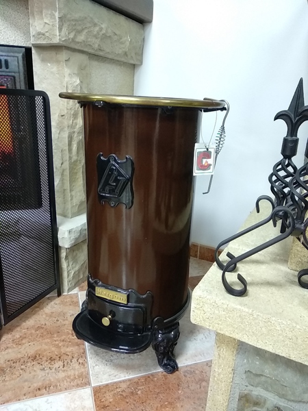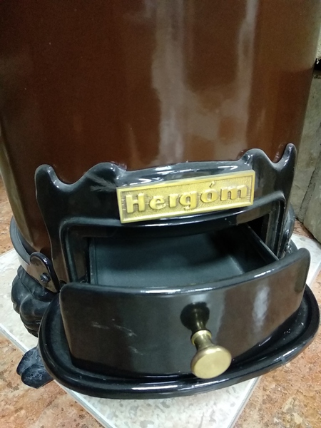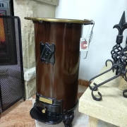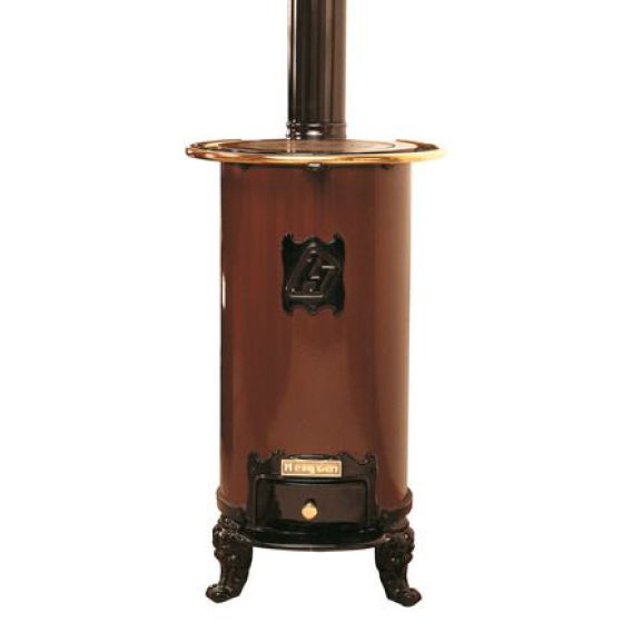 Estufa de leña tradicional cilíndrica con patas, de calor radiante, realizada en hierro fundido y acero esmaltado en color marrón madera, interior de material refractario y salida de humos trasera, de Ø 10 cm.