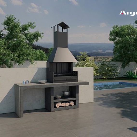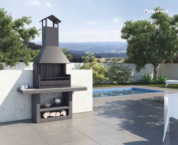 - Soporte y mesas laterales en hormigón gris y pizarra